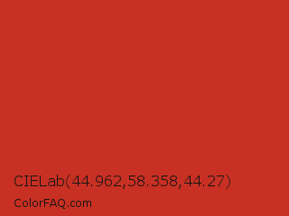 CIELab 44.962,58.358,44.27 Color is a normal red color and the nearest color is Dark Pastel Red #c23b22. Hex code #c83023 and RGB value is rgb(200,48,35). In RGB color space, this color is composed of 78% red, 19% green, 14% blue, In CMYK color space, this color is composed of 0% cyan, 76% magenta, 83% yellow , 22% black , In HSL color space, this color has a hue angle of 5° , 70% saturation and 46% lightness.
