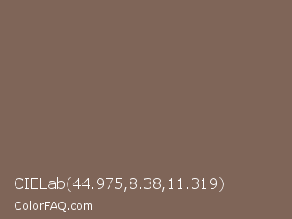 CIELab 44.975,8.38,11.319 Color is a normal orange color and the nearest color is Pastel Brown #836953. Hex code #7f6558 and RGB value is rgb(127,101,88). In RGB color space, this color is composed of 50% red, 40% green, 35% blue, In CMYK color space, this color is composed of 0% cyan, 20% magenta, 31% yellow , 50% black , In HSL color space, this color has a hue angle of 20° , 18% saturation and 42% lightness.
