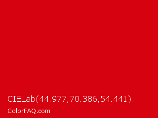 CIELab 44.977,70.386,54.441 Color is a normal red color and the nearest color is Rosso Corsa #d40000. Hex code #d7020f and RGB value is rgb(215,2,15). In RGB color space, this color is composed of 84% red, 1% green, 6% blue, In CMYK color space, this color is composed of 0% cyan, 99% magenta, 93% yellow , 16% black , In HSL color space, this color has a hue angle of 356° , 98% saturation and 43% lightness.