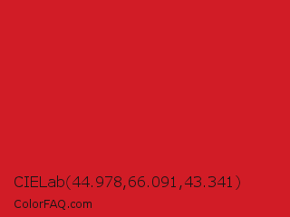 CIELab 44.978,66.091,43.341 Color is a normal red color and the nearest color is Fire Engine Red #ce2029. Hex code #d11c26 and RGB value is rgb(209,28,38). In RGB color space, this color is composed of 82% red, 11% green, 15% blue, In CMYK color space, this color is composed of 0% cyan, 87% magenta, 82% yellow , 18% black , In HSL color space, this color has a hue angle of 357° , 76% saturation and 46% lightness.