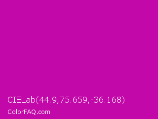 CIELab 44.9,75.659,-36.168 Color is a normal magenta color and the nearest color is Heliotrope Magenta #aa00bb. Hex code #c208a8 and RGB value is rgb(194,8,168). In RGB color space, this color is composed of 76% red, 3% green, 66% blue, In CMYK color space, this color is composed of 0% cyan, 96% magenta, 13% yellow , 24% black , In HSL color space, this color has a hue angle of 308° , 92% saturation and 40% lightness.