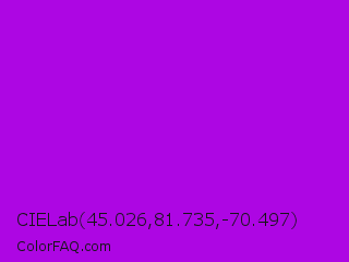 CIELab 45.026,81.735,-70.497 Color is a normal purple color and the nearest color is Vivid Mulberry #b80ce3. Hex code #ad06e3 and RGB value is rgb(173,6,227). In RGB color space, this color is composed of 68% red, 2% green, 89% blue, In CMYK color space, this color is composed of 24% cyan, 97% magenta, 0% yellow , 11% black , In HSL color space, this color has a hue angle of 285° , 95% saturation and 46% lightness.