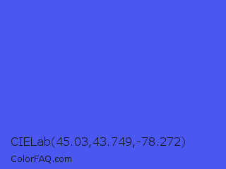 CIELab 45.03,43.749,-78.272 Color is a light blue color and the nearest color is Ultramarine Blue #4166f5. Hex code #4a57f0 and RGB value is rgb(74,87,240). In RGB color space, this color is composed of 29% red, 34% green, 94% blue, In CMYK color space, this color is composed of 69% cyan, 64% magenta, 0% yellow , 6% black , In HSL color space, this color has a hue angle of 235° , 85% saturation and 62% lightness.