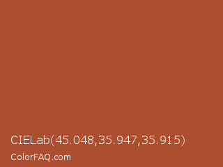 CIELab 45.048,35.947,35.915 Color is a normal color and the nearest color is Paarl #a65529. Hex code #ac4f30 and RGB value is rgb(172,79,48). In RGB color space, this color is composed of 67% red, 31% green, 19% blue, In CMYK color space, this color is composed of 0% cyan, 54% magenta, 72% yellow , 33% black , In HSL color space, this color has a hue angle of 15° , 56% saturation and 43% lightness.