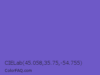 CIELab 45.058,35.75,-54.755 Color is a normal indigo color and the nearest color is Slate Blue #6a5acd. Hex code #6e59c7 and RGB value is rgb(110,89,199). In RGB color space, this color is composed of 43% red, 35% green, 78% blue, In CMYK color space, this color is composed of 45% cyan, 55% magenta, 0% yellow , 22% black , In HSL color space, this color has a hue angle of 251° , 50% saturation and 56% lightness.