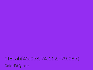 CIELab 45.058,74.112,-79.085 Color is a normal purple color and the nearest color is Veronica #a020f0. Hex code #942df2 and RGB value is rgb(148,45,242). In RGB color space, this color is composed of 58% red, 18% green, 95% blue, In CMYK color space, this color is composed of 39% cyan, 81% magenta, 0% yellow , 5% black , In HSL color space, this color has a hue angle of 271° , 88% saturation and 56% lightness.