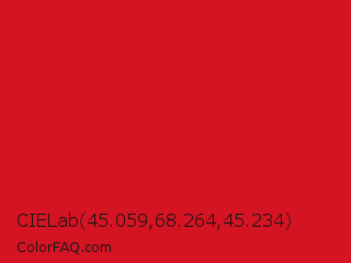 CIELab 45.059,68.264,45.234 Color is a normal red color and the nearest color is Lava #cf1020. Hex code #d41323 and RGB value is rgb(212,19,35). In RGB color space, this color is composed of 83% red, 7% green, 14% blue, In CMYK color space, this color is composed of 0% cyan, 91% magenta, 83% yellow , 17% black , In HSL color space, this color has a hue angle of 355° , 84% saturation and 45% lightness.