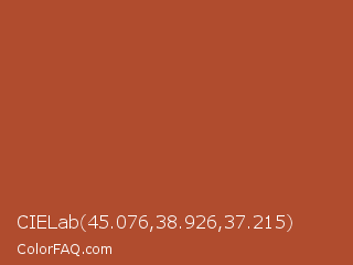 CIELab 45.076,38.926,37.215 Color is a normal red color and the nearest color is Medium Carmine #af4035. Hex code #b04c2e and RGB value is rgb(176,76,46). In RGB color space, this color is composed of 69% red, 30% green, 18% blue, In CMYK color space, this color is composed of 0% cyan, 57% magenta, 74% yellow , 31% black , In HSL color space, this color has a hue angle of 14° , 59% saturation and 44% lightness.