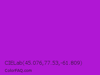 CIELab 45.076,77.53,-61.809 Color is a normal purple color and the nearest color is Vivid Mulberry #b80ce3. Hex code #b017d4 and RGB value is rgb(176,23,212). In RGB color space, this color is composed of 69% red, 9% green, 83% blue, In CMYK color space, this color is composed of 17% cyan, 89% magenta, 0% yellow , 17% black , In HSL color space, this color has a hue angle of 289° , 80% saturation and 46% lightness.