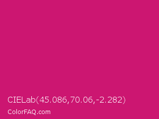 CIELab 45.086,70.06,-2.282 Color is a normal rose color and the nearest color is Magenta Dye #ca1f7b. Hex code #cc1671 and RGB value is rgb(204,22,113). In RGB color space, this color is composed of 80% red, 9% green, 44% blue, In CMYK color space, this color is composed of 0% cyan, 89% magenta, 45% yellow , 20% black , In HSL color space, this color has a hue angle of 330° , 81% saturation and 44% lightness.