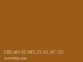 CIELab 45.087,21.61,47.72 Color is a normal orange color and the nearest color is Hawaiian Tan #9d5616. Hex code #9c5b15 and RGB value is rgb(156,91,21). In RGB color space, this color is composed of 61% red, 36% green, 8% blue, In CMYK color space, this color is composed of 0% cyan, 42% magenta, 87% yellow , 39% black , In HSL color space, this color has a hue angle of 31° , 76% saturation and 35% lightness.