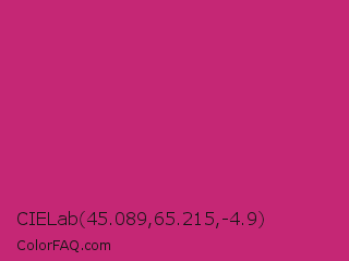 CIELab 45.089,65.215,-4.9 Color is a normal rose color and the nearest color is Magenta Dye #ca1f7b. Hex code #c52775 and RGB value is rgb(197,39,117). In RGB color space, this color is composed of 77% red, 15% green, 46% blue, In CMYK color space, this color is composed of 0% cyan, 80% magenta, 41% yellow , 23% black , In HSL color space, this color has a hue angle of 330° , 67% saturation and 46% lightness.