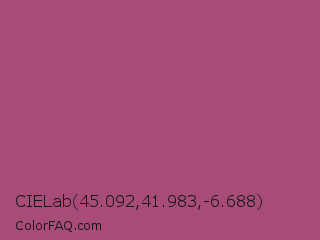 CIELab 45.092,41.983,-6.688 Color is a normal rose color and the nearest color is Magenta Haze #9f4576. Hex code #a64c77 and RGB value is rgb(166,76,119). In RGB color space, this color is composed of 65% red, 30% green, 47% blue, In CMYK color space, this color is composed of 0% cyan, 54% magenta, 28% yellow , 35% black , In HSL color space, this color has a hue angle of 331° , 37% saturation and 47% lightness.