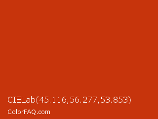CIELab 45.116,56.277,53.853 Color is a normal red color and the nearest color is Sinopia #cb410b. Hex code #c7340c and RGB value is rgb(199,52,12). In RGB color space, this color is composed of 78% red, 20% green, 5% blue, In CMYK color space, this color is composed of 0% cyan, 74% magenta, 94% yellow , 22% black , In HSL color space, this color has a hue angle of 13° , 89% saturation and 41% lightness.