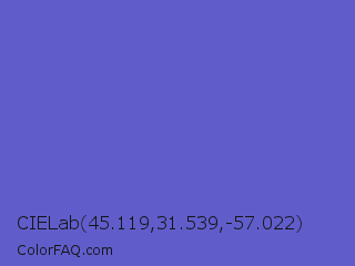 CIELab 45.119,31.539,-57.022 Color is a normal indigo color and the nearest color is Slate Blue #6a5acd. Hex code #605dcb and RGB value is rgb(96,93,203). In RGB color space, this color is composed of 38% red, 36% green, 80% blue, In CMYK color space, this color is composed of 53% cyan, 54% magenta, 0% yellow , 20% black , In HSL color space, this color has a hue angle of 242° , 51% saturation and 58% lightness.