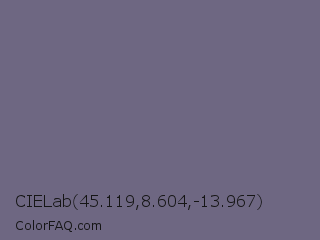 CIELab 45.119,8.604,-13.967 Color is a normal indigo color and the nearest color is Rum #796989. Hex code #6e6782 and RGB value is rgb(110,103,130). In RGB color space, this color is composed of 43% red, 40% green, 51% blue, In CMYK color space, this color is composed of 15% cyan, 21% magenta, 0% yellow , 49% black , In HSL color space, this color has a hue angle of 256° , 12% saturation and 46% lightness.