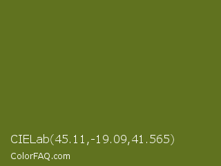 CIELab 45.11,-19.09,41.565 Color is a dark lime color and the nearest color is Fern Frond #657220. Hex code #60721f and RGB value is rgb(96,114,31). In RGB color space, this color is composed of 38% red, 45% green, 12% blue, In CMYK color space, this color is composed of 16% cyan, 0% magenta, 73% yellow , 55% black , In HSL color space, this color has a hue angle of 73° , 57% saturation and 28% lightness.