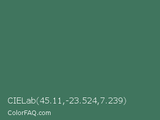 CIELab 45.11,-23.524,7.239 Color is a normal green color and the nearest color is Amazon #3b7a57. Hex code #40755e and RGB value is rgb(64,117,94). In RGB color space, this color is composed of 25% red, 46% green, 37% blue, In CMYK color space, this color is composed of 45% cyan, 0% magenta, 20% yellow , 54% black , In HSL color space, this color has a hue angle of 154° , 29% saturation and 35% lightness.