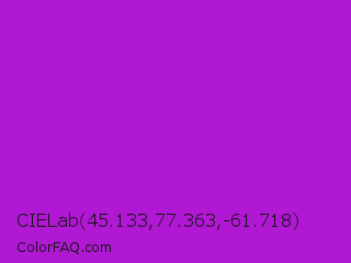 CIELab 45.133,77.363,-61.718 Color is a normal purple color and the nearest color is Vivid Mulberry #b80ce3. Hex code #b018d4 and RGB value is rgb(176,24,212). In RGB color space, this color is composed of 69% red, 9% green, 83% blue, In CMYK color space, this color is composed of 17% cyan, 89% magenta, 0% yellow , 17% black , In HSL color space, this color has a hue angle of 289° , 80% saturation and 46% lightness.