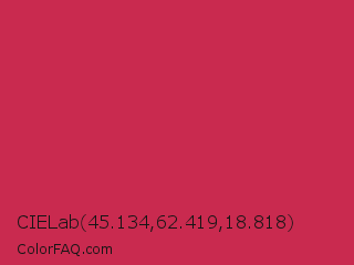 CIELab 45.134,62.419,18.818 Color is a normal red color and the nearest color is French Raspberry #c72c48. Hex code #c92a4f and RGB value is rgb(201,42,79). In RGB color space, this color is composed of 79% red, 16% green, 31% blue, In CMYK color space, this color is composed of 0% cyan, 79% magenta, 61% yellow , 21% black , In HSL color space, this color has a hue angle of 346° , 65% saturation and 48% lightness.