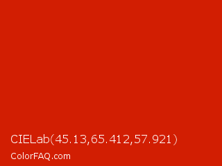 CIELab 45.13,65.412,57.921 Color is a normal red color and the nearest color is International Orange Engineering #ba160c. Hex code #d21e02 and RGB value is rgb(210,30,2). In RGB color space, this color is composed of 82% red, 12% green, 1% blue, In CMYK color space, this color is composed of 0% cyan, 86% magenta, 99% yellow , 18% black , In HSL color space, this color has a hue angle of 8° , 98% saturation and 42% lightness.