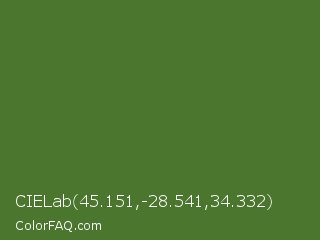 CIELab 45.151,-28.541,34.332 Color is a normal green color and the nearest color is Sap Green #507d2a. Hex code #4b762e and RGB value is rgb(75,118,46). In RGB color space, this color is composed of 29% red, 46% green, 18% blue, In CMYK color space, this color is composed of 36% cyan, 0% magenta, 61% yellow , 54% black , In HSL color space, this color has a hue angle of 96° , 44% saturation and 32% lightness.
