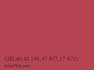 CIELab 45.166,47.857,17.672 Color is a normal red color and the nearest color is Deep Chestnut #b94e48. Hex code #b74350 and RGB value is rgb(183,67,80). In RGB color space, this color is composed of 72% red, 26% green, 31% blue, In CMYK color space, this color is composed of 0% cyan, 63% magenta, 56% yellow , 28% black , In HSL color space, this color has a hue angle of 353° , 46% saturation and 49% lightness.