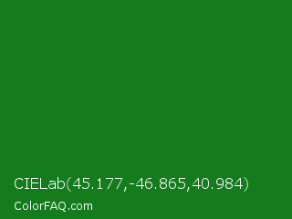CIELab 45.177,-46.865,40.984 Color is a dark green color and the nearest color is Forest Green #228b22. Hex code #157c1e and RGB value is rgb(21,124,30). In RGB color space, this color is composed of 8% red, 49% green, 12% blue, In CMYK color space, this color is composed of 83% cyan, 0% magenta, 76% yellow , 51% black , In HSL color space, this color has a hue angle of 125° , 71% saturation and 28% lightness.