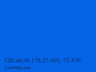 CIELab 45.178,27.665,-72.478 Color is a normal blue color and the nearest color is Blue Ribbon #0066ff. Hex code #0563e6 and RGB value is rgb(5,99,230). In RGB color space, this color is composed of 2% red, 39% green, 90% blue, In CMYK color space, this color is composed of 98% cyan, 57% magenta, 0% yellow , 10% black , In HSL color space, this color has a hue angle of 215° , 96% saturation and 46% lightness.