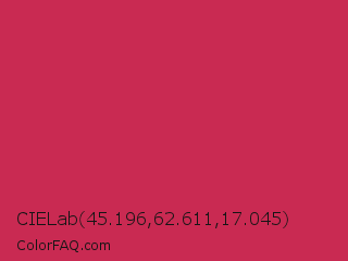 CIELab 45.196,62.611,17.045 Color is a normal red color and the nearest color is Dingy Dungeon #c53151. Hex code #c92a52 and RGB value is rgb(201,42,82). In RGB color space, this color is composed of 79% red, 16% green, 32% blue, In CMYK color space, this color is composed of 0% cyan, 79% magenta, 59% yellow , 21% black , In HSL color space, this color has a hue angle of 345° , 65% saturation and 48% lightness.
