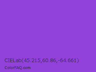 CIELab 45.215,60.86,-64.661 Color is a normal purple color and the nearest color is Dark Orchid #9932cc. Hex code #9140d9 and RGB value is rgb(145,64,217). In RGB color space, this color is composed of 57% red, 25% green, 85% blue, In CMYK color space, this color is composed of 33% cyan, 71% magenta, 0% yellow , 15% black , In HSL color space, this color has a hue angle of 272° , 67% saturation and 55% lightness.