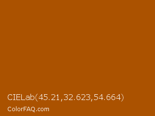 CIELab 45.21,32.623,54.664 Color is a normal orange color and the nearest color is Windsor Tan #a75502. Hex code #ab5200 and RGB value is rgb(171,82,0). In RGB color space, this color is composed of 67% red, 32% green, 0% blue, In CMYK color space, this color is composed of 0% cyan, 52% magenta, 100% yellow , 33% black , In HSL color space, this color has a hue angle of 29° , 100% saturation and 34% lightness.