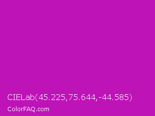 CIELab 45.225,75.644,-44.585 Color is a normal magenta color and the nearest color is Heliotrope Magenta #aa00bb. Hex code #bd13b7 and RGB value is rgb(189,19,183). In RGB color space, this color is composed of 74% red, 7% green, 72% blue, In CMYK color space, this color is composed of 0% cyan, 90% magenta, 3% yellow , 26% black , In HSL color space, this color has a hue angle of 302° , 82% saturation and 41% lightness.