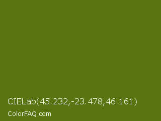 CIELab 45.232,-23.478,46.161 Color is a dark lime color and the nearest color is Fern Frond #657220. Hex code #5a7412 and RGB value is rgb(90,116,18). In RGB color space, this color is composed of 35% red, 45% green, 7% blue, In CMYK color space, this color is composed of 22% cyan, 0% magenta, 84% yellow , 55% black , In HSL color space, this color has a hue angle of 76° , 73% saturation and 26% lightness.