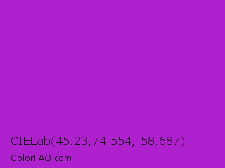 CIELab 45.23,74.554,-58.687 Color is a normal purple color and the nearest color is Dark Orchid #9932cc. Hex code #af21cf and RGB value is rgb(175,33,207). In RGB color space, this color is composed of 69% red, 13% green, 81% blue, In CMYK color space, this color is composed of 15% cyan, 84% magenta, 0% yellow , 19% black , In HSL color space, this color has a hue angle of 289° , 73% saturation and 47% lightness.