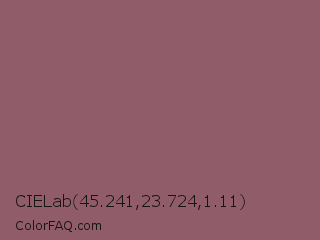 CIELab 45.241,23.724,1.11 Color is a normal rose color and the nearest color is Mauve Taupe #915f6d. Hex code #915c6a and RGB value is rgb(145,92,106). In RGB color space, this color is composed of 57% red, 36% green, 42% blue, In CMYK color space, this color is composed of 0% cyan, 37% magenta, 27% yellow , 43% black , In HSL color space, this color has a hue angle of 344° , 22% saturation and 46% lightness.