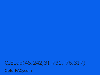 CIELab 45.242,31.731,-76.317 Color is a normal blue color and the nearest color is Blue Ribbon #0066ff. Hex code #0861ed and RGB value is rgb(8,97,237). In RGB color space, this color is composed of 3% red, 38% green, 93% blue, In CMYK color space, this color is composed of 97% cyan, 59% magenta, 0% yellow , 7% black , In HSL color space, this color has a hue angle of 217° , 93% saturation and 48% lightness.