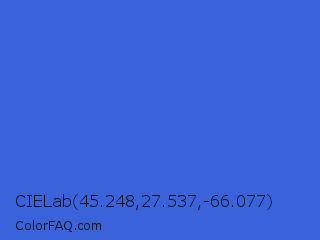 CIELab 45.248,27.537,-66.077 Color is a normal blue color and the nearest color is Royal Blue #4169e1. Hex code #3962db and RGB value is rgb(57,98,219). In RGB color space, this color is composed of 22% red, 38% green, 86% blue, In CMYK color space, this color is composed of 74% cyan, 55% magenta, 0% yellow , 14% black , In HSL color space, this color has a hue angle of 225° , 69% saturation and 54% lightness.