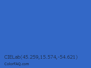 CIELab 45.259,15.574,-54.621 Color is a normal blue color and the nearest color is Mariner #286acd. Hex code #3368c7 and RGB value is rgb(51,104,199). In RGB color space, this color is composed of 20% red, 41% green, 78% blue, In CMYK color space, this color is composed of 74% cyan, 48% magenta, 0% yellow , 22% black , In HSL color space, this color has a hue angle of 219° , 59% saturation and 49% lightness.