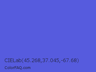 CIELab 45.268,37.045,-67.68 Color is a normal blue color and the nearest color is Majorelle Blue #6050dc. Hex code #565bde and RGB value is rgb(86,91,222). In RGB color space, this color is composed of 34% red, 36% green, 87% blue, In CMYK color space, this color is composed of 61% cyan, 59% magenta, 0% yellow , 13% black , In HSL color space, this color has a hue angle of 238° , 67% saturation and 60% lightness.