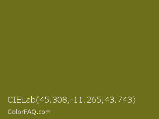 CIELab 45.308,-11.265,43.743 Color is a dark yellow color and the nearest color is Fern Frond #657220. Hex code #6e6f1b and RGB value is rgb(110,111,27). In RGB color space, this color is composed of 43% red, 44% green, 11% blue, In CMYK color space, this color is composed of 1% cyan, 0% magenta, 76% yellow , 56% black , In HSL color space, this color has a hue angle of 61° , 61% saturation and 27% lightness.