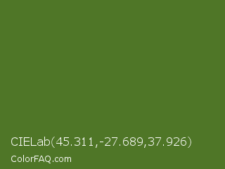 CIELab 45.311,-27.689,37.926 Color is a normal green color and the nearest color is Sap Green #507d2a. Hex code #4f7627 and RGB value is rgb(79,118,39). In RGB color space, this color is composed of 31% red, 46% green, 15% blue, In CMYK color space, this color is composed of 33% cyan, 0% magenta, 67% yellow , 54% black , In HSL color space, this color has a hue angle of 90° , 50% saturation and 31% lightness.
