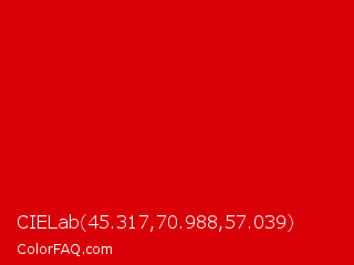 CIELab 45.317,70.988,57.039 Color is a normal red color and the nearest color is Rosso Corsa #d40000. Hex code #d90008 and RGB value is rgb(217,0,8). In RGB color space, this color is composed of 85% red, 0% green, 3% blue, In CMYK color space, this color is composed of 0% cyan, 100% magenta, 96% yellow , 15% black , In HSL color space, this color has a hue angle of 358° , 100% saturation and 43% lightness.