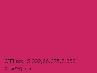 CIELab 45.332,66.075,7.358 Color is a normal rose color and the nearest color is Rose Red #c21e56. Hex code #cb2362 and RGB value is rgb(203,35,98). In RGB color space, this color is composed of 80% red, 14% green, 38% blue, In CMYK color space, this color is composed of 0% cyan, 83% magenta, 52% yellow , 20% black , In HSL color space, this color has a hue angle of 338° , 71% saturation and 47% lightness.