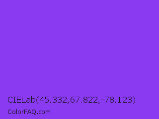 CIELab 45.332,67.822,-78.123 Color is a normal violet color and the nearest color is Blue Violet #8a2be2. Hex code #8a3af1 and RGB value is rgb(138,58,241). In RGB color space, this color is composed of 54% red, 23% green, 95% blue, In CMYK color space, this color is composed of 43% cyan, 76% magenta, 0% yellow , 5% black , In HSL color space, this color has a hue angle of 266° , 87% saturation and 59% lightness.