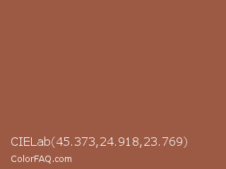 CIELab 45.373,24.918,23.769 Color is a normal red color and the nearest color is Sepia Skin #9e5b40. Hex code #9c5a45 and RGB value is rgb(156,90,69). In RGB color space, this color is composed of 61% red, 35% green, 27% blue, In CMYK color space, this color is composed of 0% cyan, 42% magenta, 56% yellow , 39% black , In HSL color space, this color has a hue angle of 14° , 39% saturation and 44% lightness.
