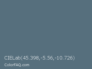 CIELab 45.398,-5.56,-10.726 Color is a normal blue color and the nearest color is Paynes Grey #536878. Hex code #566f7d and RGB value is rgb(86,111,125). In RGB color space, this color is composed of 34% red, 44% green, 49% blue, In CMYK color space, this color is composed of 31% cyan, 11% magenta, 0% yellow , 51% black , In HSL color space, this color has a hue angle of 202° , 18% saturation and 41% lightness.
