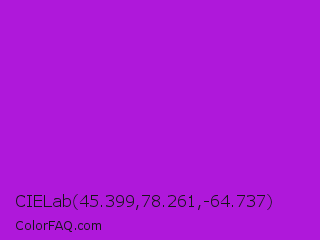 CIELab 45.399,78.261,-64.737 Color is a normal purple color and the nearest color is Vivid Mulberry #b80ce3. Hex code #af18da and RGB value is rgb(175,24,218). In RGB color space, this color is composed of 69% red, 9% green, 85% blue, In CMYK color space, this color is composed of 20% cyan, 89% magenta, 0% yellow , 15% black , In HSL color space, this color has a hue angle of 287° , 80% saturation and 47% lightness.