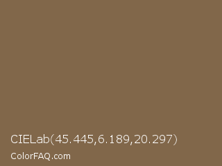 CIELab 45.445,6.189,20.297 Color is a normal orange color and the nearest color is Raw Umber #826644. Hex code #81674a and RGB value is rgb(129,103,74). In RGB color space, this color is composed of 51% red, 40% green, 29% blue, In CMYK color space, this color is composed of 0% cyan, 20% magenta, 43% yellow , 49% black , In HSL color space, this color has a hue angle of 32° , 27% saturation and 40% lightness.