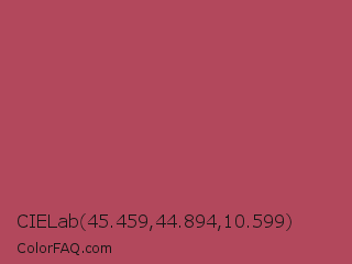 CIELab 45.459,44.894,10.599 Color is a normal red color and the nearest color is Hippie Pink #ae4560. Hex code #b2485c and RGB value is rgb(178,72,92). In RGB color space, this color is composed of 70% red, 28% green, 36% blue, In CMYK color space, this color is composed of 0% cyan, 60% magenta, 48% yellow , 30% black , In HSL color space, this color has a hue angle of 349° , 42% saturation and 49% lightness.